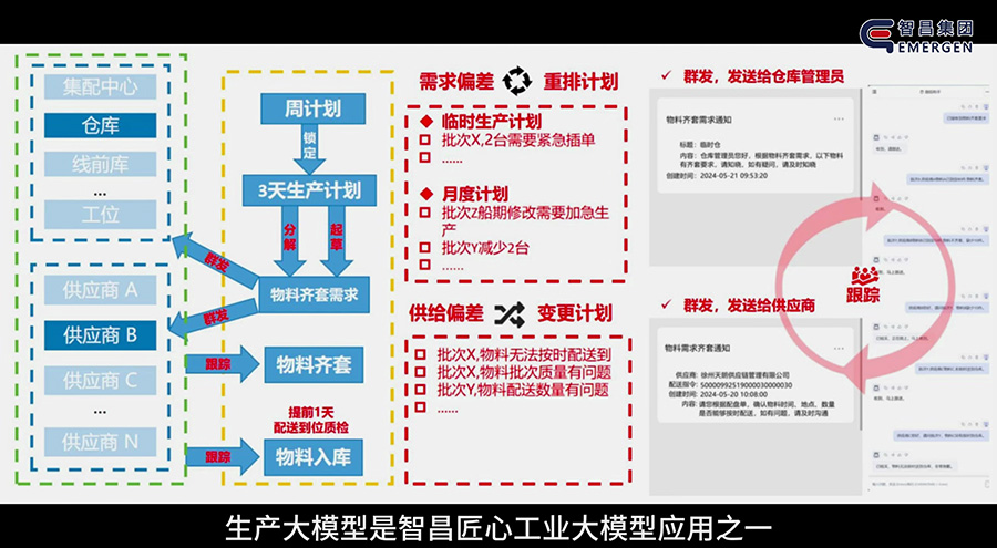 在物料齊套環節,智昌集團部署基于智昌匠心工業大模型的智能體工作流,替代傳統人工的信息匯總、供應商溝通及物流跟蹤等復雜操作,結合RPA技術實現全流程自動化,顯著提升齊套率并降低人力成本。